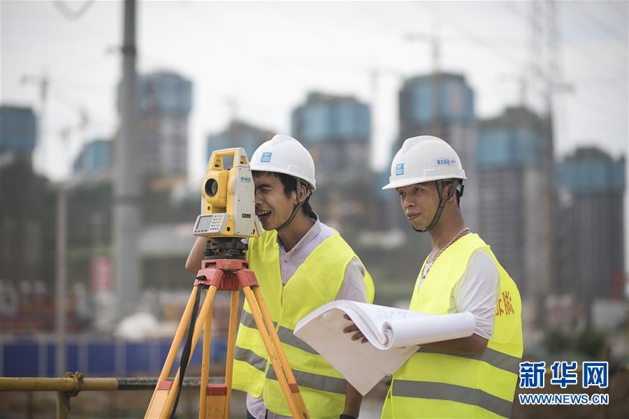 武汉黄家湖大道城市地下综合管廊及同步道路提升改造工程项目施工员兰增林(右)、方维在测绘管廊主体。他们是奋战在军运会工地上的“90后”新农民工(2018年5月14日摄)。新华社记者 肖艺九 摄
