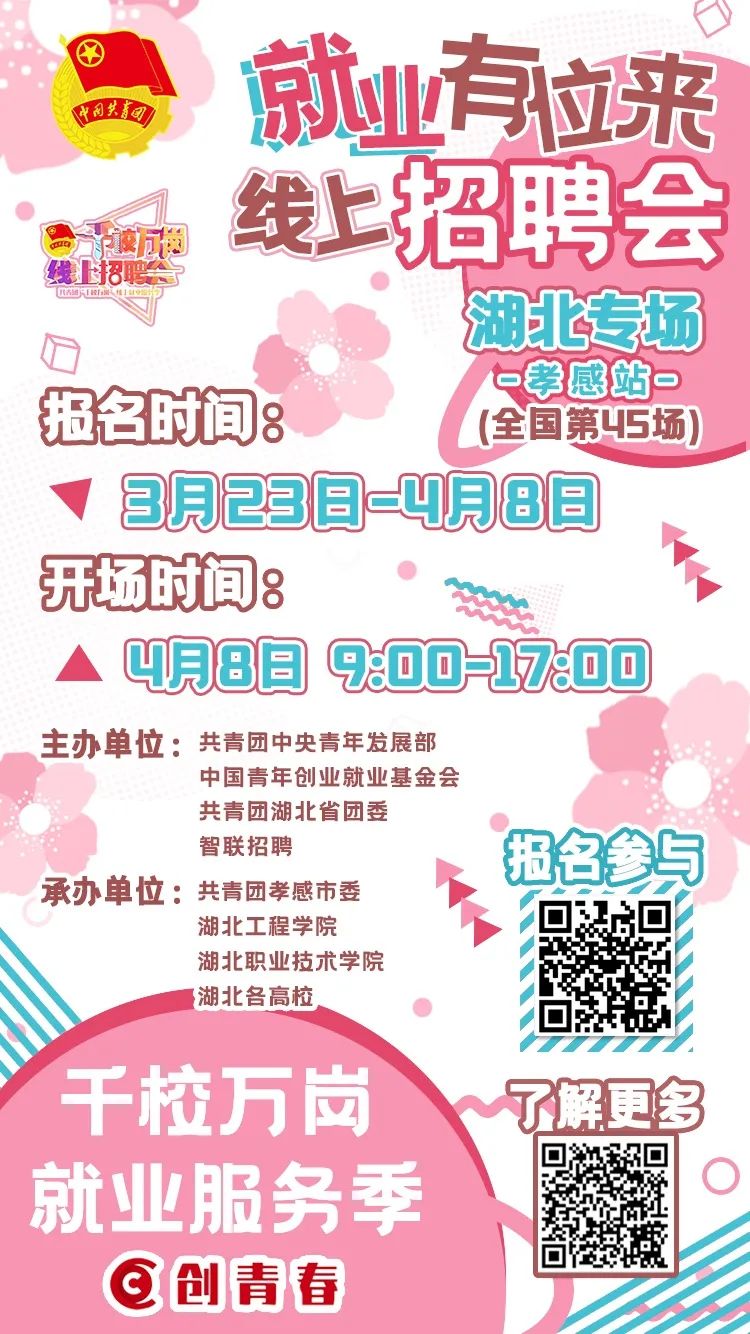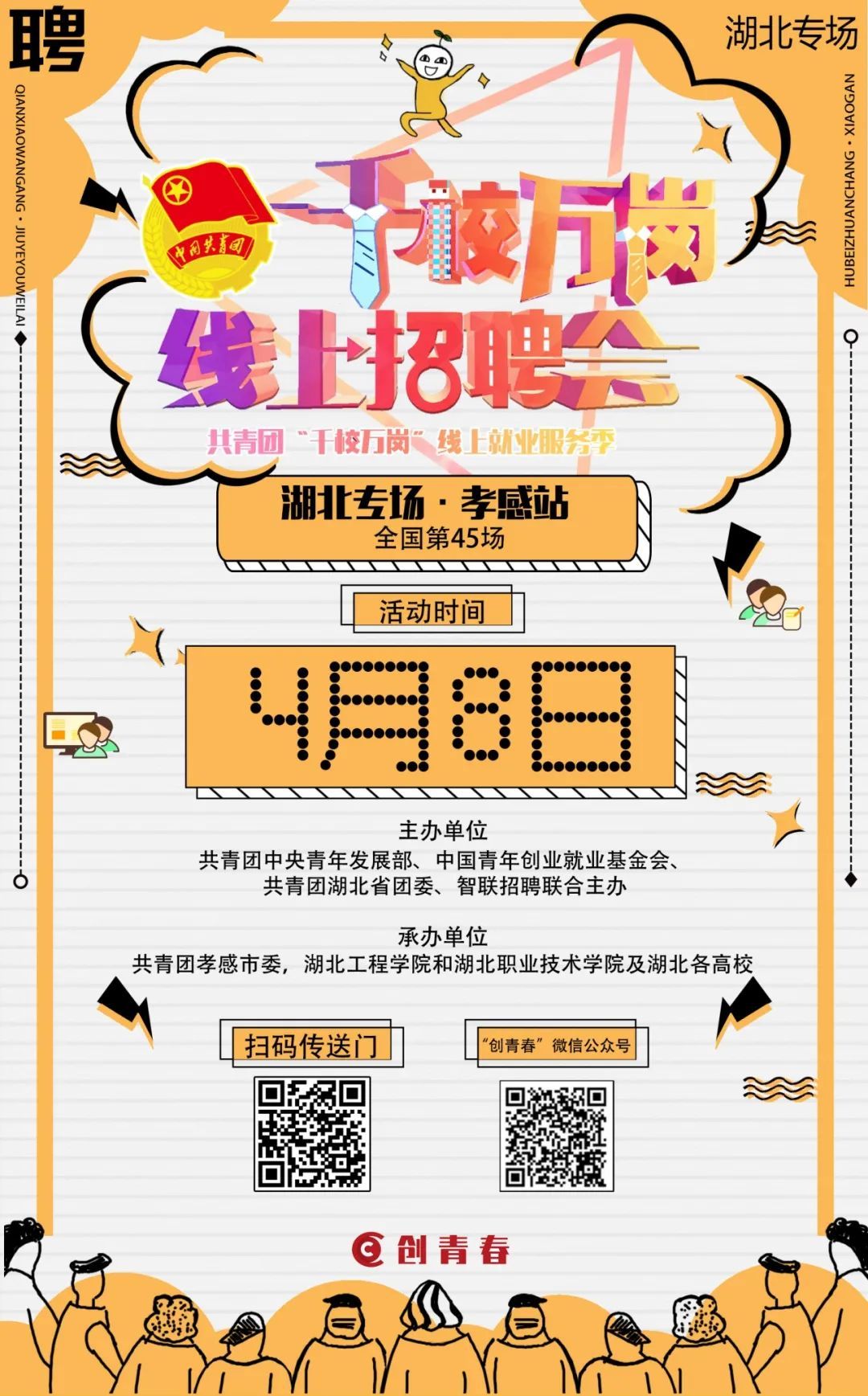 由共青团中央青年发展部、中国青年创业就业基金会、共青团湖北省委、智联招聘联合主办,共青团孝感市委、湖北工程学院、湖北职业技术学院承办的“千校万岗·就业有位来”湖北(孝感)专场线上招聘会将于2020年4月8日通过网络平台举行。