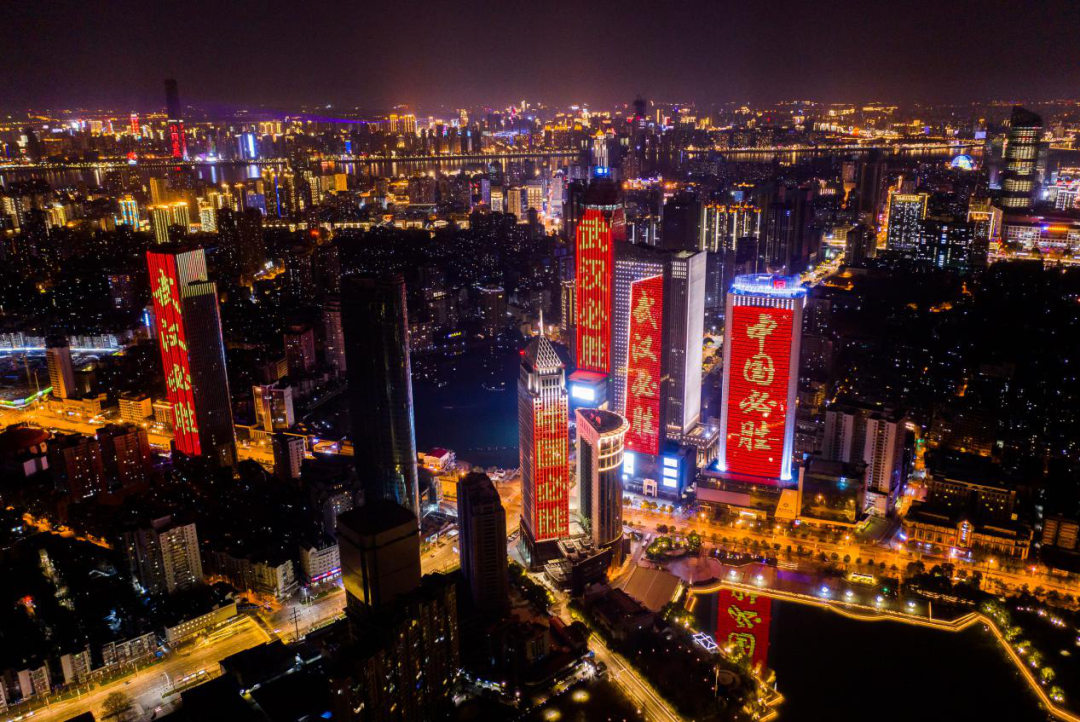 图为在抗击疫情期间,武汉的高楼大厦外墙显现出“武汉必胜”“中国必胜”标语。湖北日报全媒记者 柯皓/摄