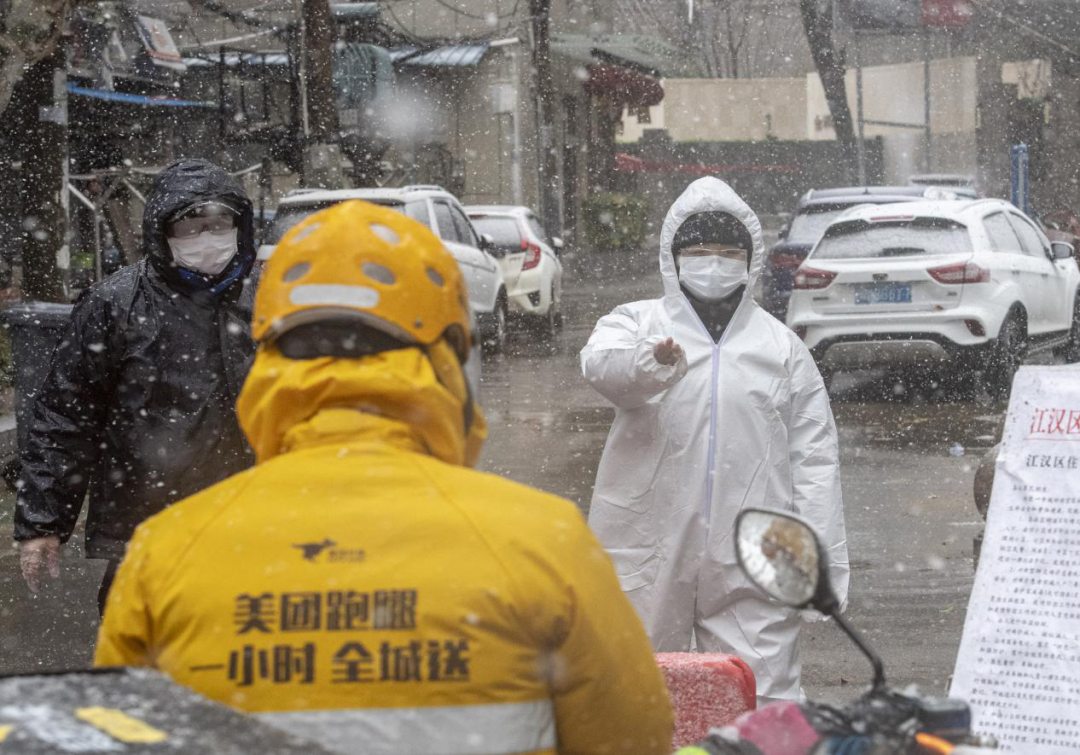 图为在抗疫斗争中,来自各级党政机关、事业单位的下沉党员干部在小区入口值守。湖北日报全媒记者 魏铼/摄