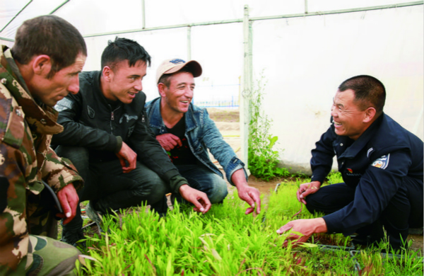 ▲ 新疆红其拉甫边检站民警孙超向塔吉克族牧民传授种植技术。