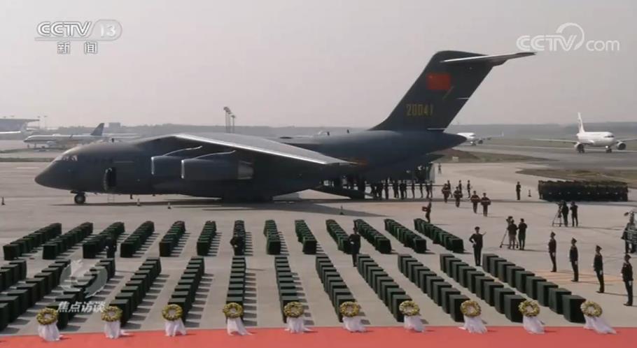 27日11点18分, 载有117位在韩志愿军烈士遗骸的中国空军运-20专机降落在沈阳桃仙国际机场。机场用 “过水门”迎接祖国的英雄儿女回家,这是航空界最高级别礼仪。两架中国空军歼11—B战机低空拉烟通场,向英雄致敬。