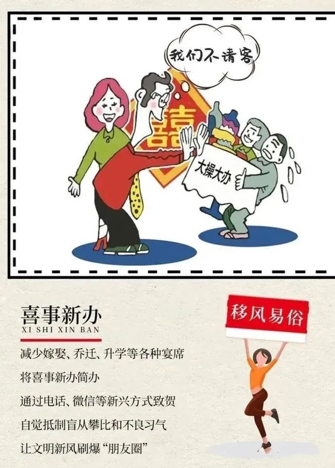一、喜事缓办简办。大力弘扬时代新风,在疫情防控特殊时期,倡导取消或延期举办嫁娶、生育、乔迁等喜庆事。遏制大操大办、人情攀比等铺张浪费现象,力求破除重收彩礼陋习,树立婚事简办新风。提倡微信贺喜、网络送祝福等方式,最大限度阻断病毒可能传播途径,杜绝人员聚集。
