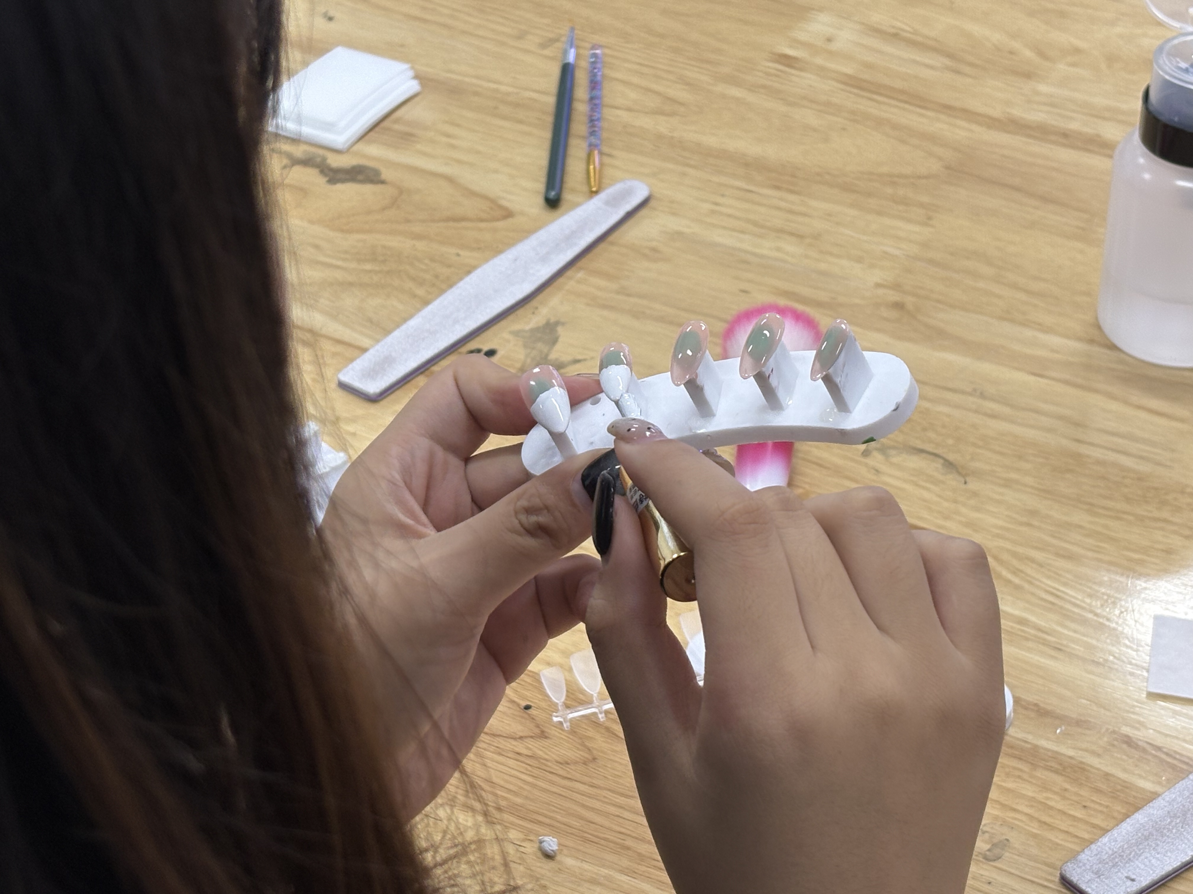 在实践操作环节,县残联特邀专业美甲老师进行现场授课指导,学生们专注投入,充分发挥创意,运用专用颜料勾勒图案、点缀纹饰,部分学生还采用晕染技法打造渐变效果,设计巧思与美甲艺术巧妙融合。现场还有专业老师实时为学生解决设计制作中的难题,保障实践教学效果。