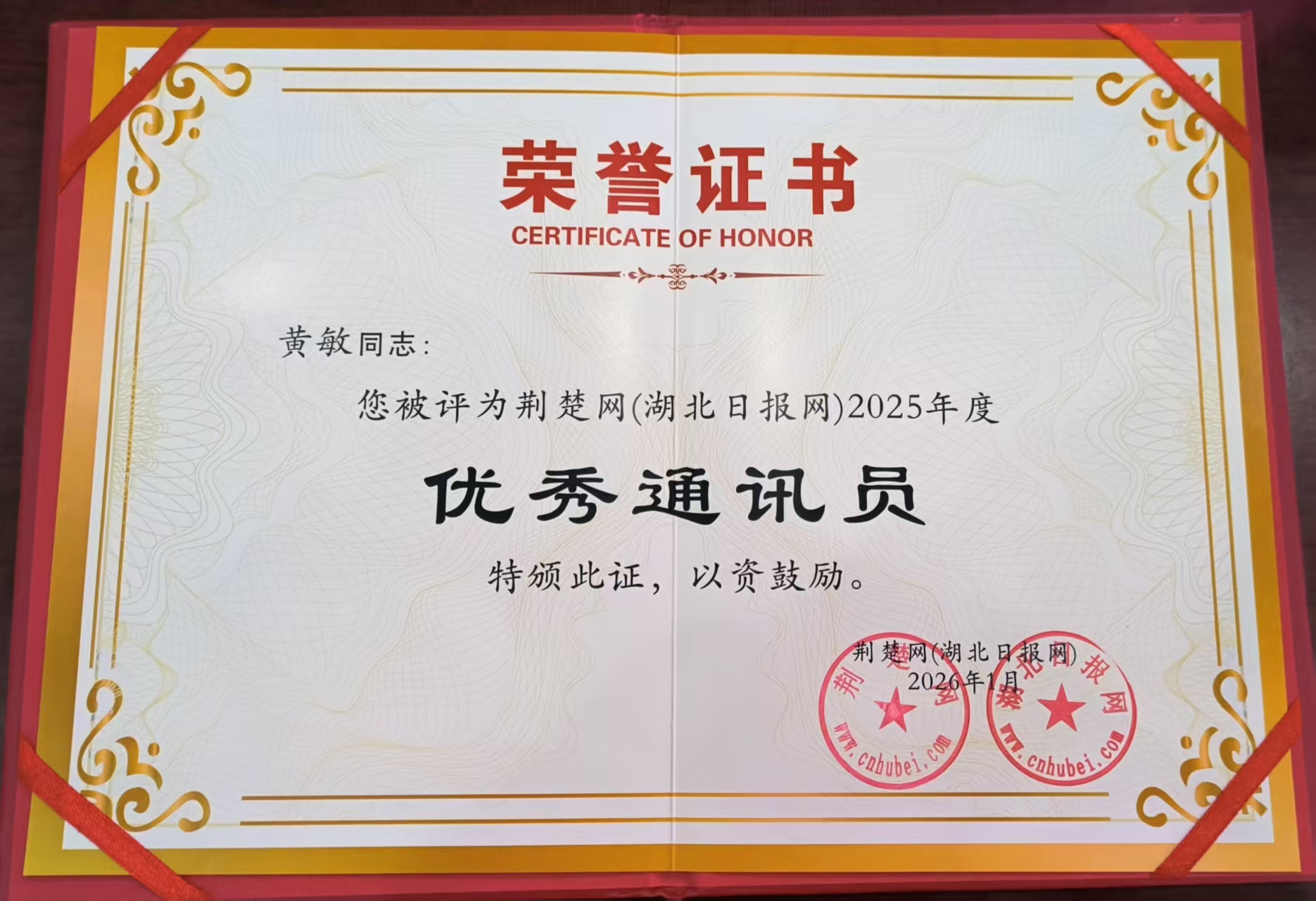 我是云梦县水利和湖泊局的新闻通讯员黄敏。今天能荣获荆楚网(湖北日报网)2025年度“优秀通讯员”称号,我的内心满是感激与忐忑。这份荣誉不仅是对我个人工作的认可,更承载着组织的培养、媒体同仁的厚爱和同事们的支持!在此,我要衷心感谢荆楚网(湖北日报网)、云梦县委宣传部和局领导的悉心栽培,感谢编辑记者们的耐心指导,更要感谢身边同事朋友们的热忱帮助!这份荣誉,不仅是云梦县的光荣,更是各级部门对云梦县水利和湖泊局工作的高度肯定,是属于我们整个水利系统的集体荣光!