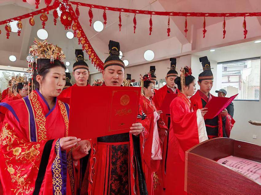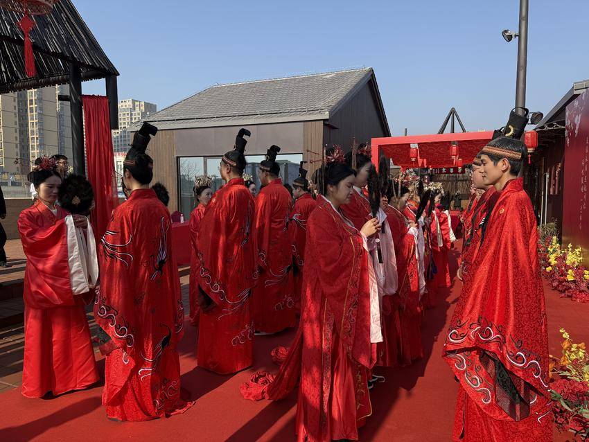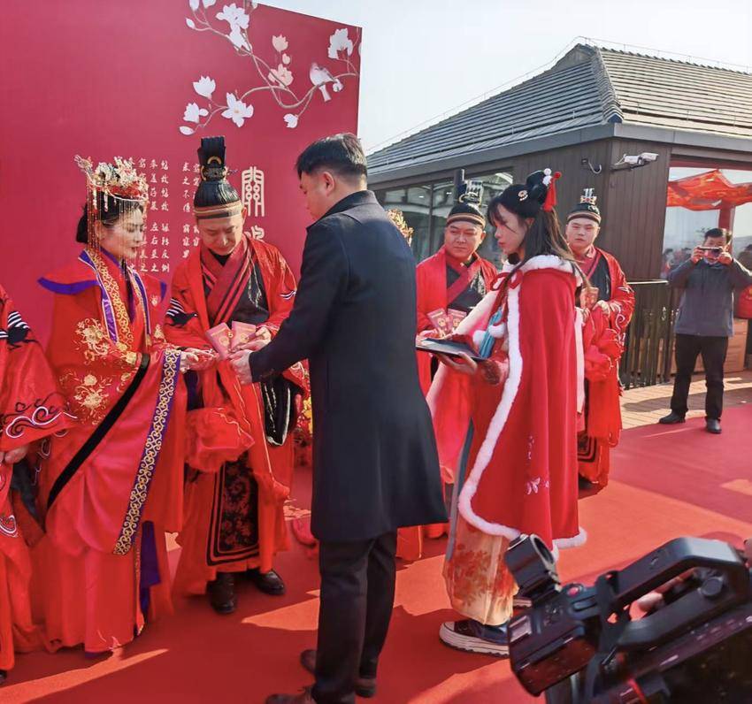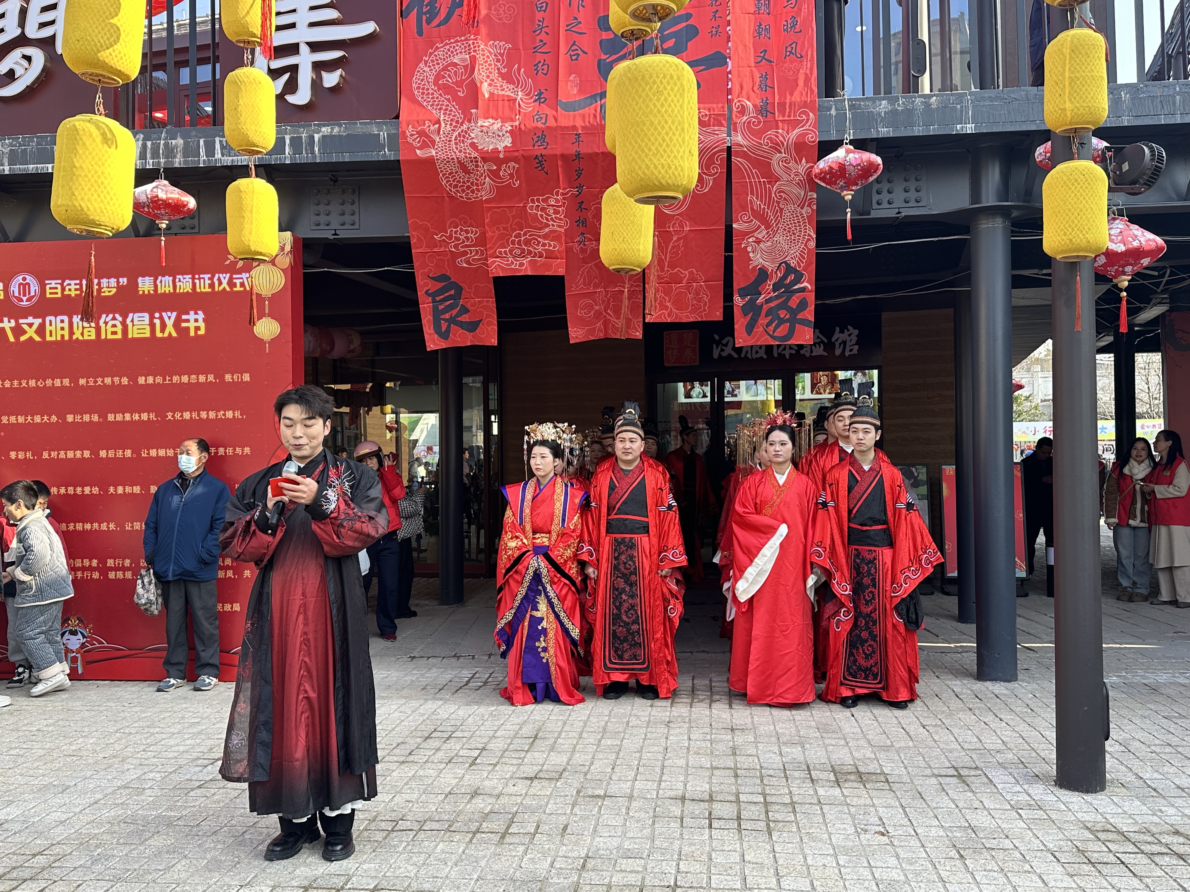 活动现场暖意融融,古乐清扬婉转。上午10时10分,新人们手牵红绸,缓步拾级而上,在礼台上整齐列队。古色古香的场馆与飘逸的汉服相映成趣,尽显传统婚俗的独特韵味与文化魅力。