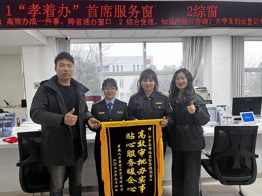 新年伊始,暖意先行。1月4日,新年首个工作日,县市场监管局的办事大厅里响起了阵阵真诚的道谢声。孝感人才集团(云梦)有限公司负责人许先生专程到访,将一面印着“贴心服务暖企心 高效审批办实事”的锦旗送到工作人员手中,用最朴实的方式表达深深谢意。