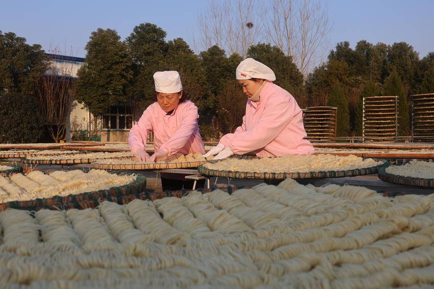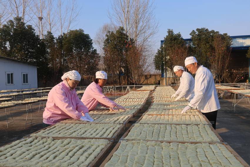 1月16日,在云梦县刘文华鱼面厂的晾晒场上,木制晾晒架整齐地排成了排,切制好的鱼面被码成细密的长条,身着工作服、头戴卫生帽的工人们正穿梭其间,轻轻翻动鱼面,风过时裹着鱼面特有的鲜香气味在场地间散开。眼下虽然正值三九寒冬,但连日的暖阳为鱼面晾晒提供了绝佳的条件,工厂正加足马力,保障春节市场供应。