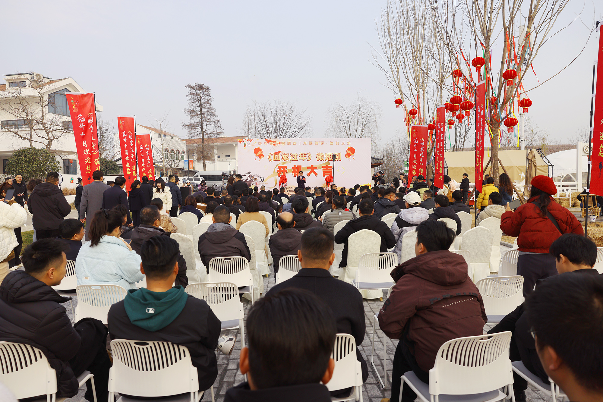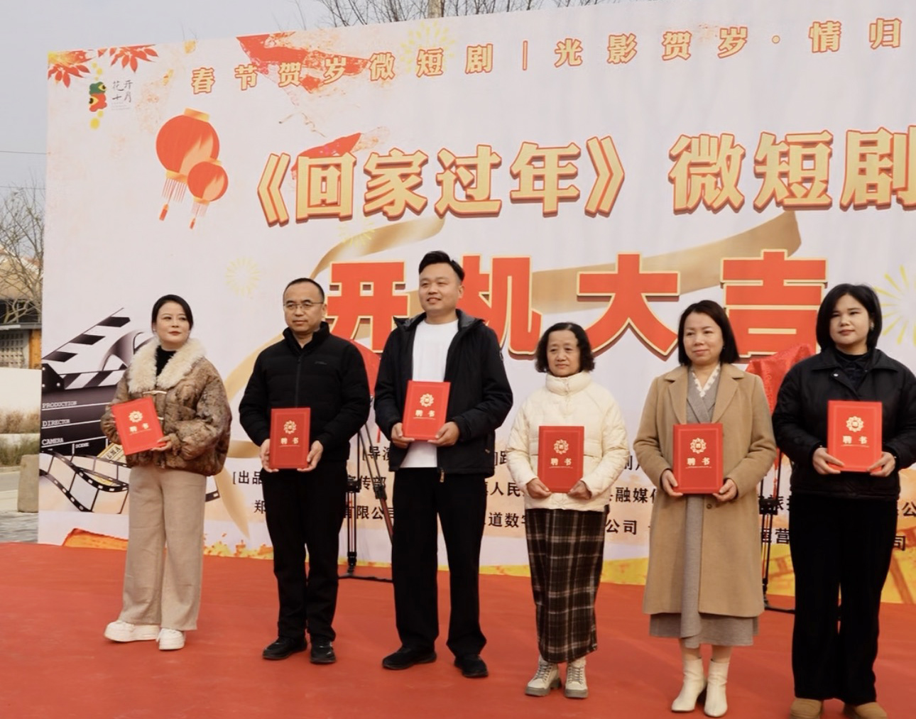与会县领导与《回家过年》微短剧主创团队共同揭开摄像机上的红布,祝愿拍摄顺利、收视长虹。