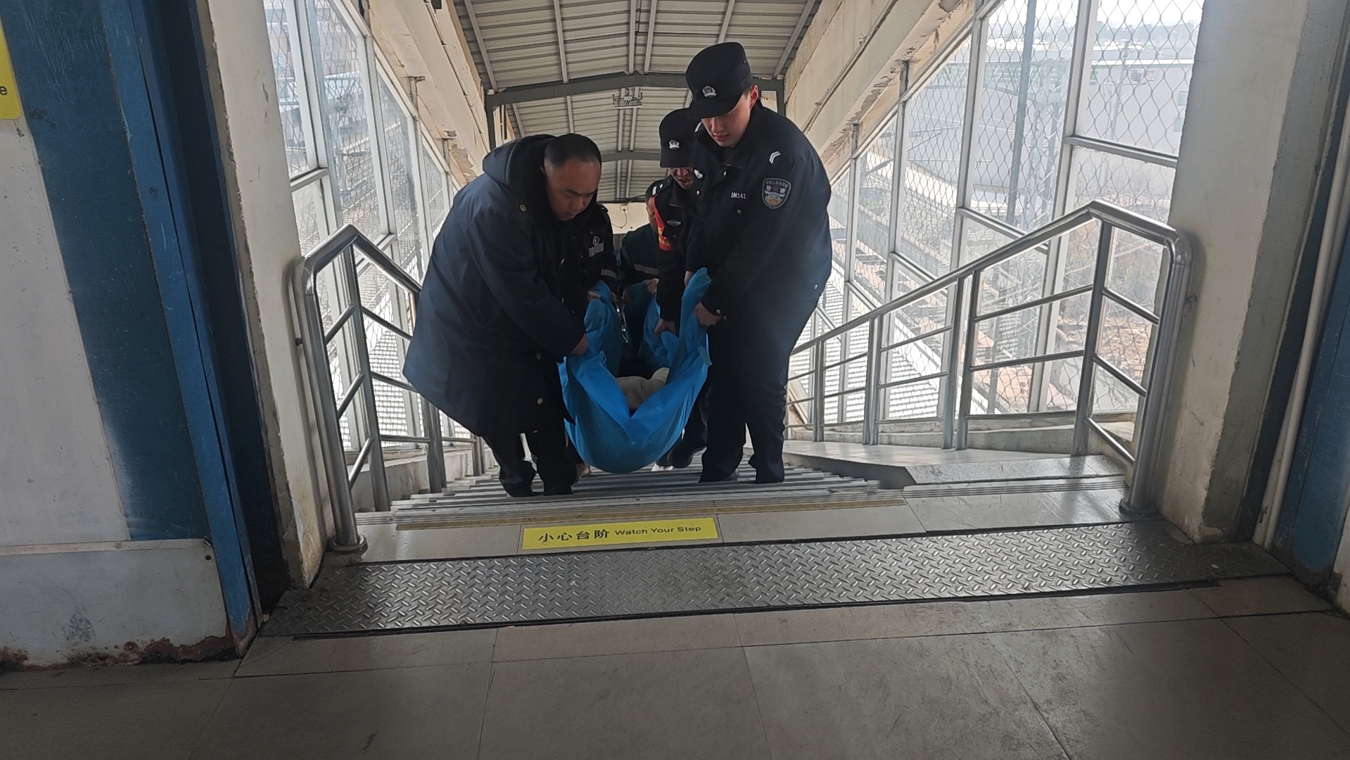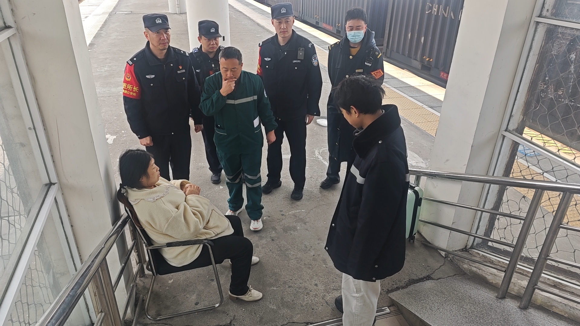 因站台无电梯,转运难度较大。急救人员抵达后,所长左圆圆、民警李翼飞、戴议政与医护人员、车站工作人员紧密配合,小心稳妥地护送孕妇,全程平稳、安全地将其转移至救护车上,看着救护车鸣笛驶离。