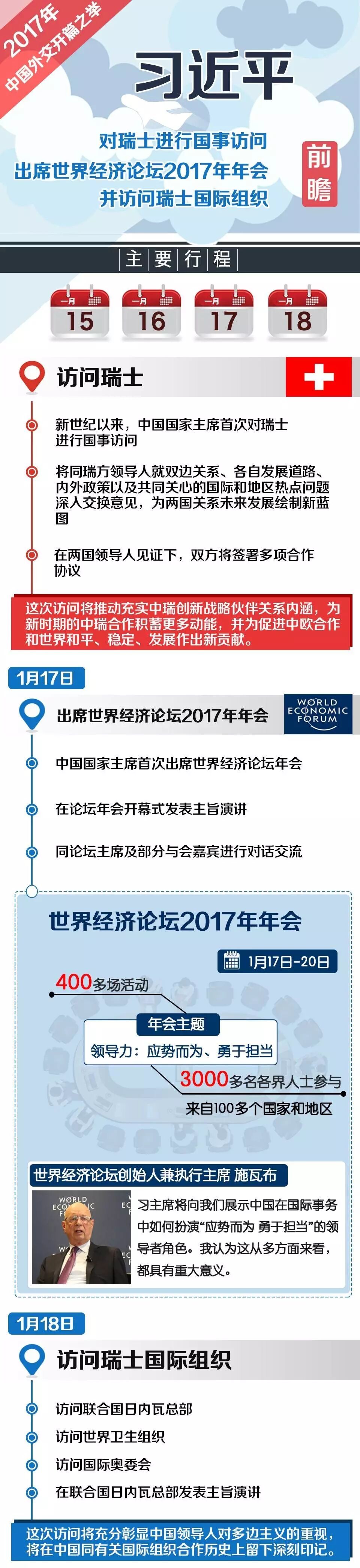 作为2017年中国外交开篇之举,1月15日至18日,习近平主席将对瑞士进行国事访问、出席世界经济论坛2017年年会并访问瑞士国际组织。