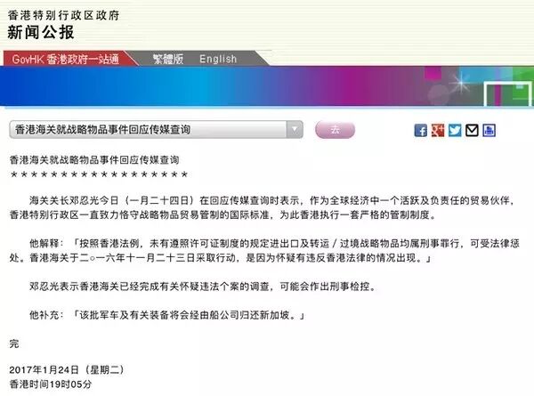 香港海关昨日公布,已完成遭扣押新加坡装甲车等战略物品怀疑违法个案的调查,该批军车及有关装备将经由船公司归还新加坡。香港海关表示仍可能作出刑事检控。新加坡外交部也发公告称梁振英已通知李显龙,李显龙已回函致谢。