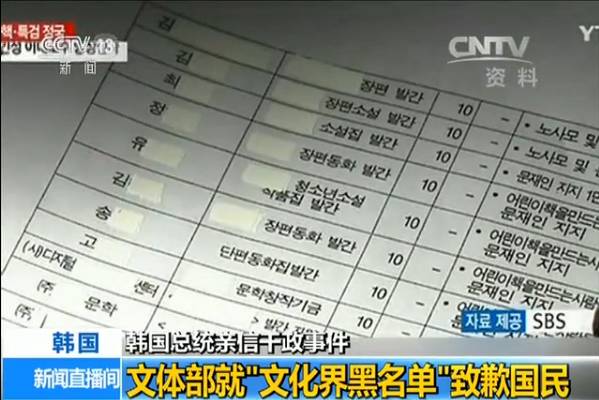韩国文化体育观光部23日就“文化界黑名单”一事向国民致歉,称将与调查人员充分配合以查明真相。此前“亲信干政”事件特检组怀疑青瓦台曾制定“文化界黑名单”,并指示禁止名单上人员参加政府赞助的活动或从相关活动中获益。