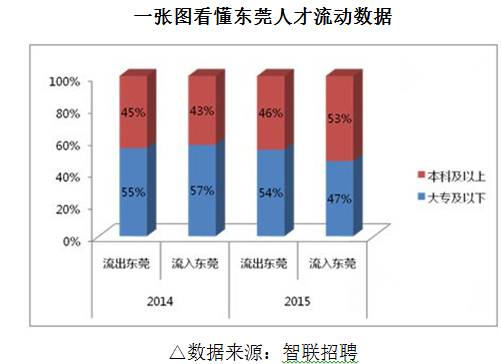 随着产业转型升级加快,人员流动性也明显增强。据智联招聘发布数据显示,2015年东莞人才流动整体概况为净流入43%,净流出57%。在学历构成上看,东莞流出人才主要是大专及以下学历,2014-2015年均维持在55%左右。而2015年流入东莞的人才中,本科及以上学历高达53%,相比2014年提升10%。