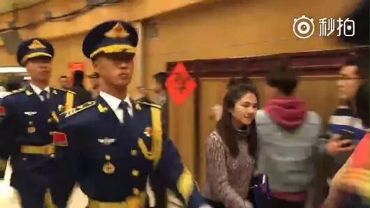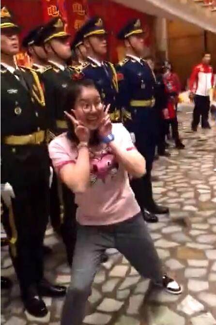 1月21日,央视春晚第四次联排间隙,傅园慧偶遇三军仪仗队,从此,她的表情包又多了一组……