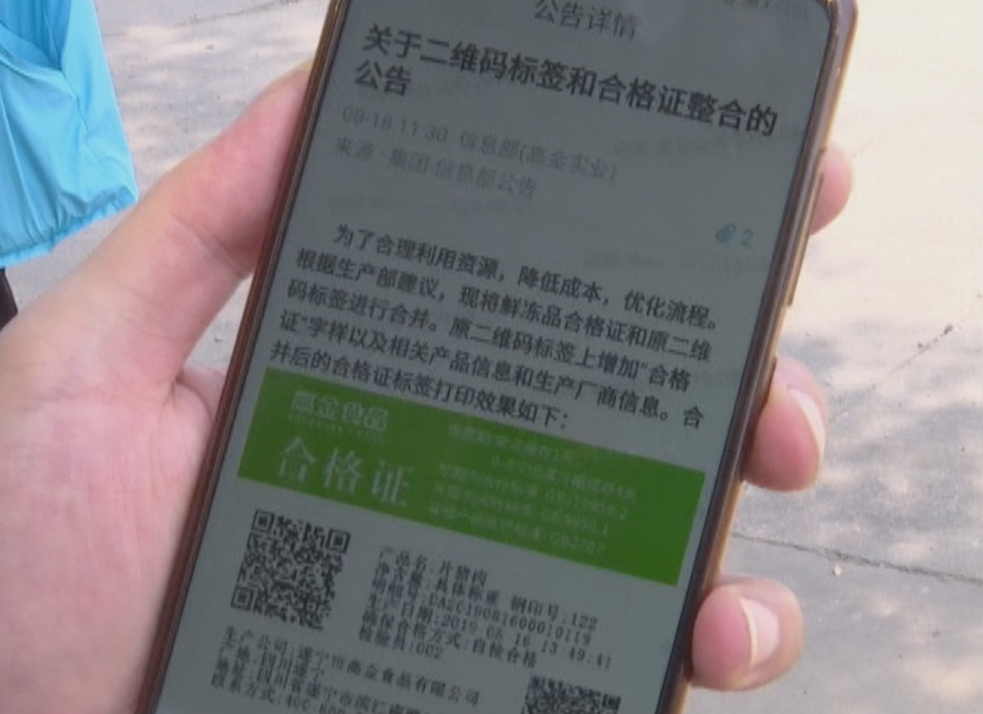 【湖北高金食品有限公司总经理 何顺】这个是我们公司白桥的合格证的一个标签编码,这个上面涵盖了所有的我们工厂的信息,老百姓可以通过二维码扫描之后,得到全产业链的基本追溯。