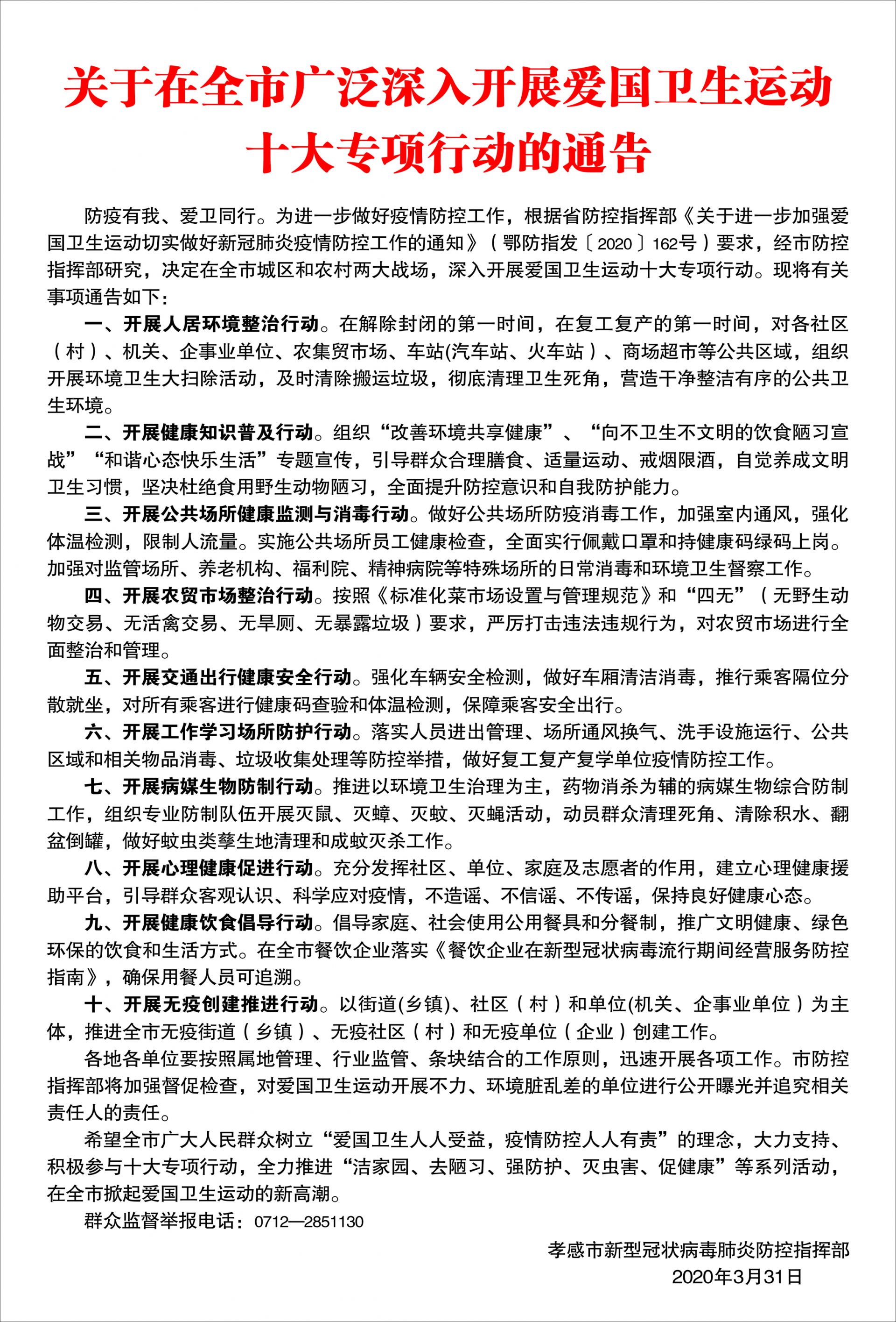 关于在全市广泛深入开展爱国卫生运动十大专项行动的通告