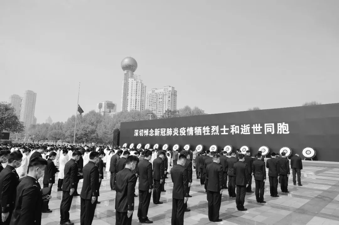 10时整,悼念活动开始,汽车、火车、舰船纷纷鸣笛,防空警报响彻江城,全体人员静立垂首,向抗击新冠肺炎疫情斗争牺牲烈士和逝世同胞默哀。同时,武汉全市道路亮起红灯,所有车辆停止行驶,路上行人就地肃立默哀。这一刻,江城泣涕,山河凝滞,天地动容。