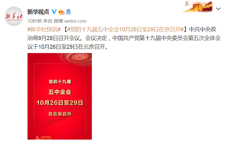 党的十九届五中全会10月26日至29日在京召开 2020-09-29 08:48 0 中共中央政治局9月28日召开会议。会议决定,中国共产党第十九届中央委员会第五次全体会议于10月26日至29日在北京召开。 编辑:康丽琳