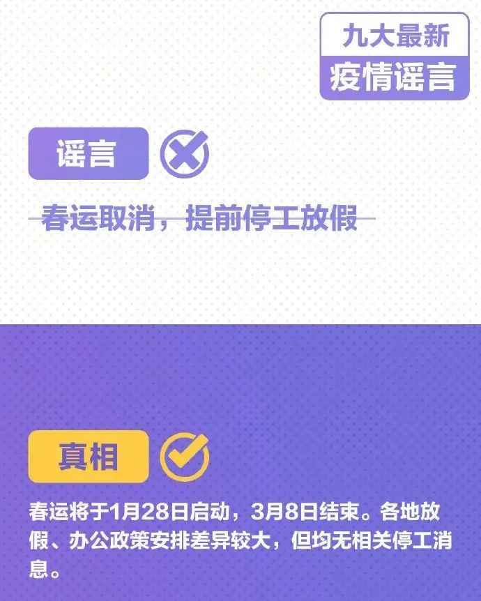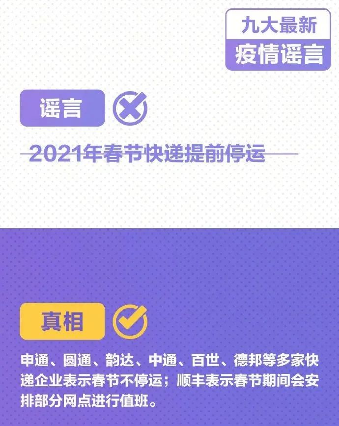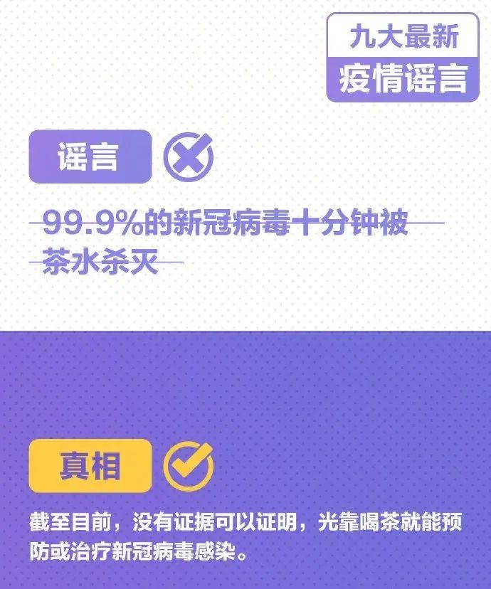 病毒可被茶水杀灭、春运“取消”、快递停运……千万别被骗! 2021-01-18 14:56 0 99.9%的新冠病毒十分钟被茶水杀灭 新冠疫苗接种开放网站预约 2021年春节快递提前停运 春运直接被“取消”…… 年关将至 又有关于疫情的谣言在网上流传 九大最新谣言背后的真相↓↓ 疫情当前 不造谣! 不信谣! 不传谣!