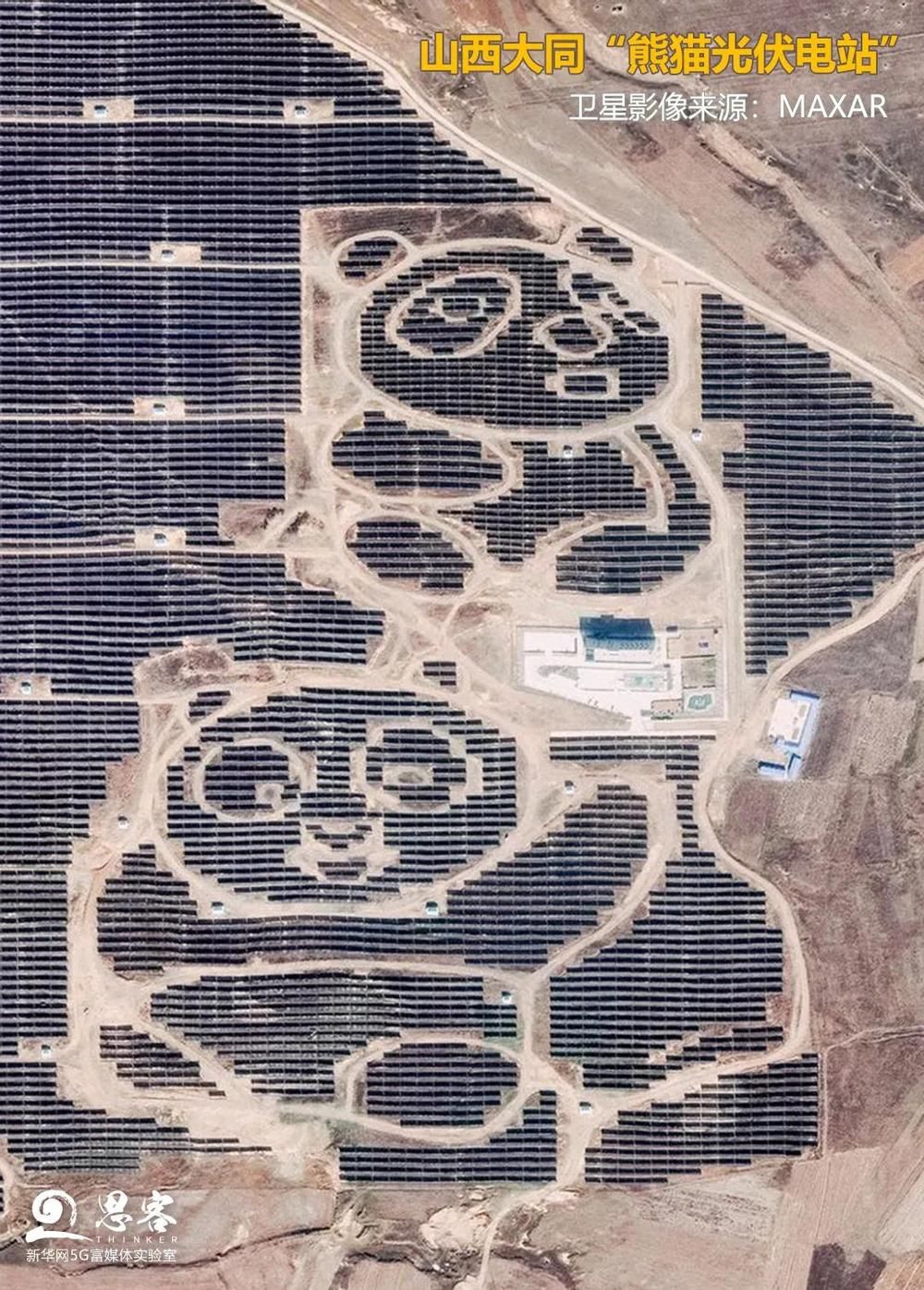 位于山西大同市郊的“熊猫光伏电站”是全球首个以熊猫为造型的光伏电站,从空中俯瞰,两个憨态可掬的熊猫宝宝在大地上扮萌,格外引人注目。