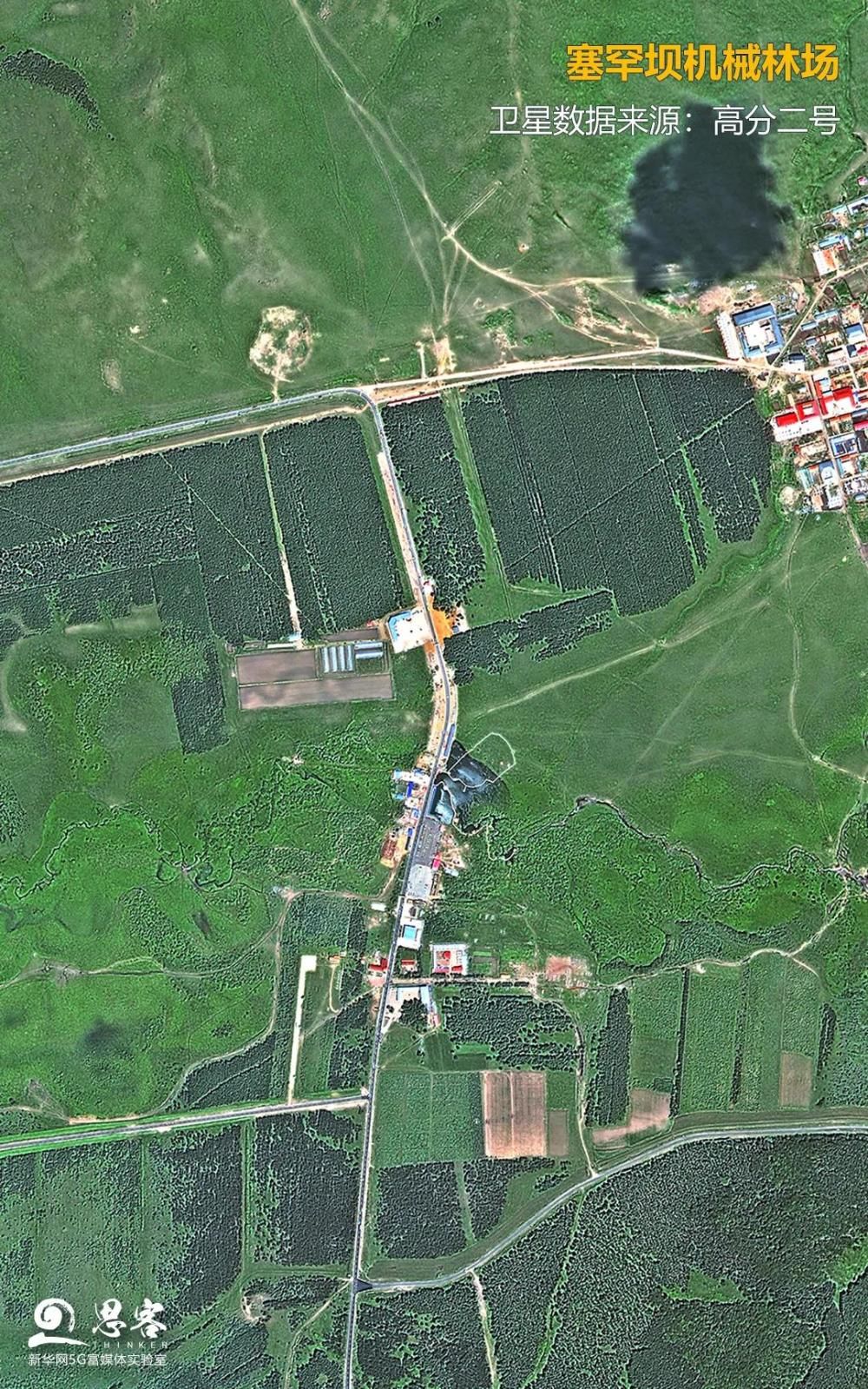 卫星视角下的塞罕坝机械林场,一排排整齐的机械林分布其间。卫星数据来源:高分二号