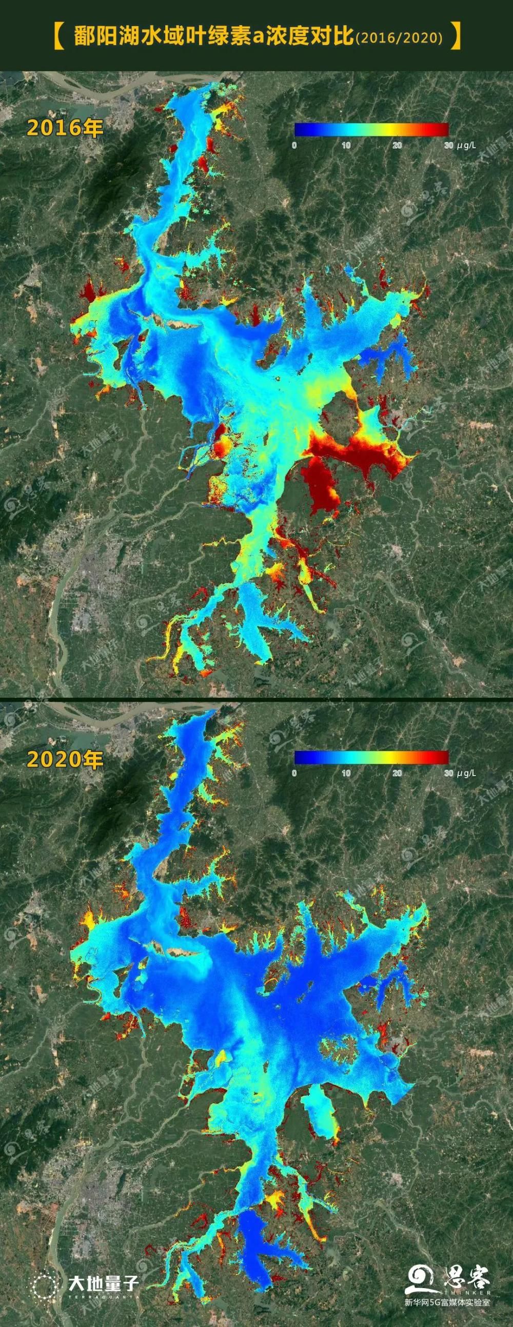 图为鄱阳湖水域叶绿素a浓度2016年与2020年对比图。卫星数据分析:大地量子