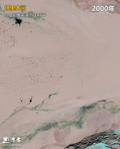 卫星拍到的塔里木河2000与2019年对比图。卫星数据来源:TERRA